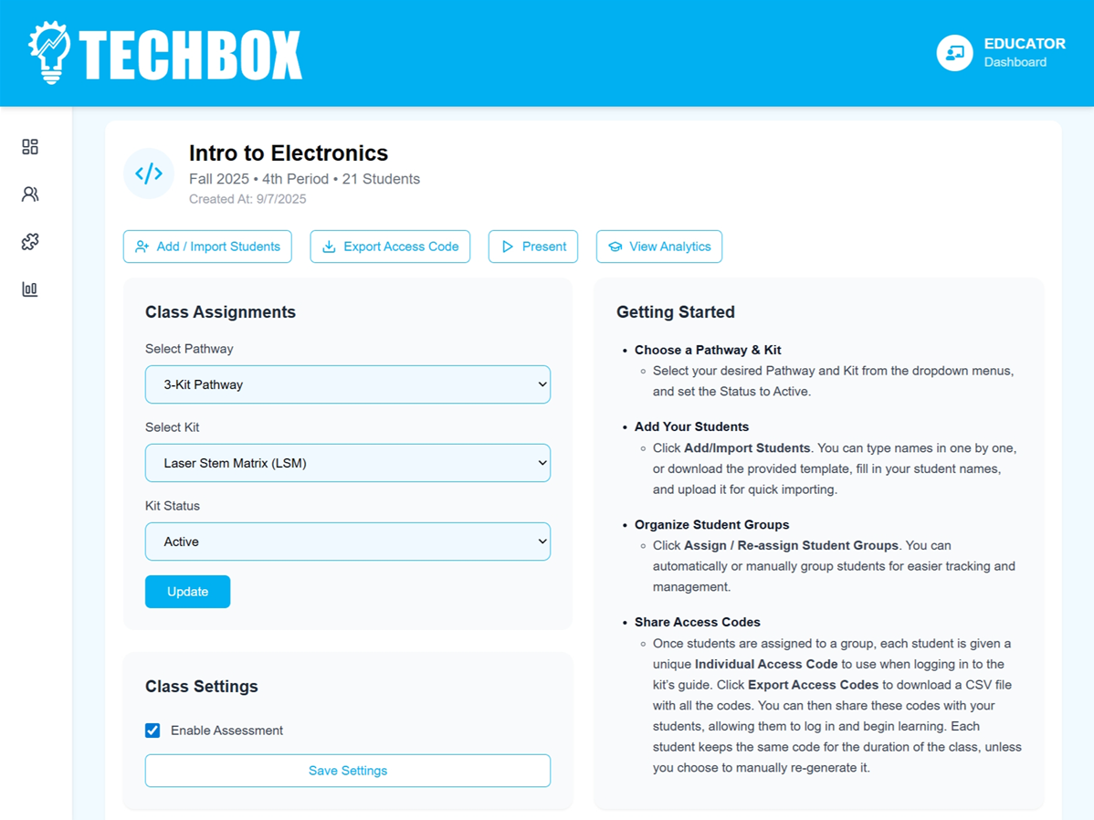Educators assign the project, share access codes, and distribute kits.