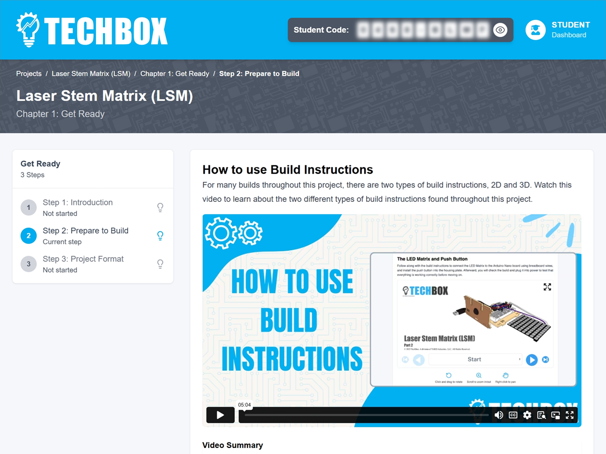 Students work through guided build instructions, then deepen their knowledge through video-led instruction and interactive checkpoints.