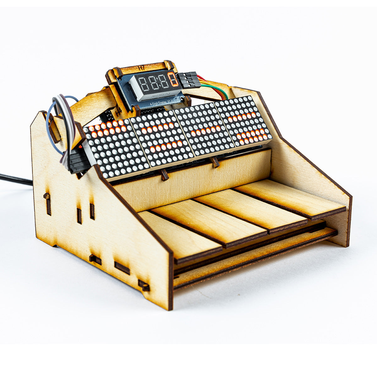 - LCD Alarm Clock – A step up in complexity, learners wire and assemble a working digital clock using an LCD display, a rocker switch, and a potentiometer.